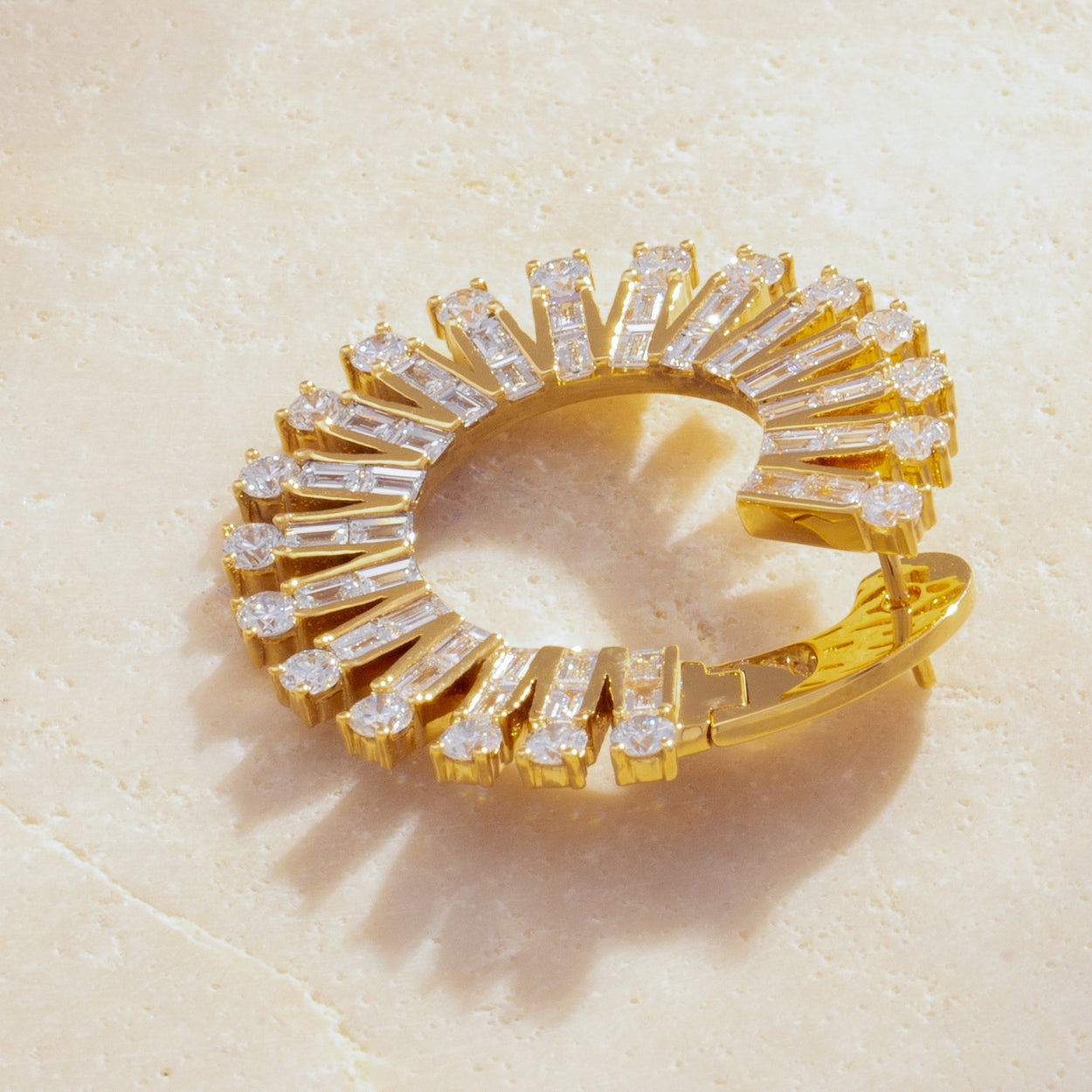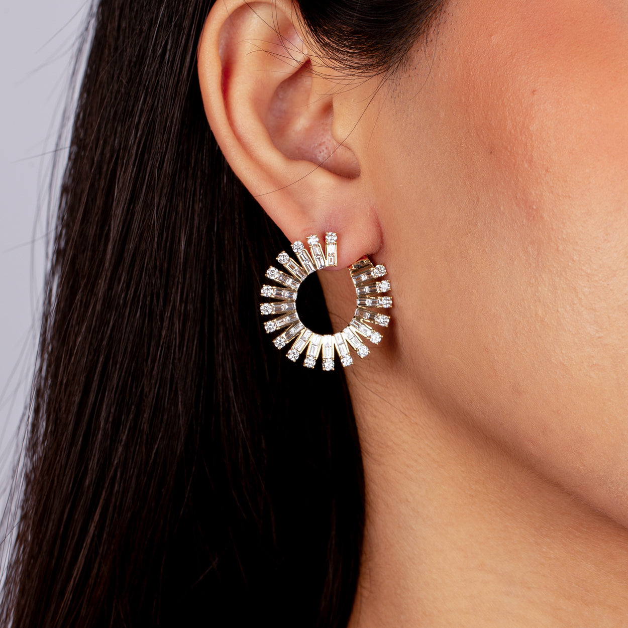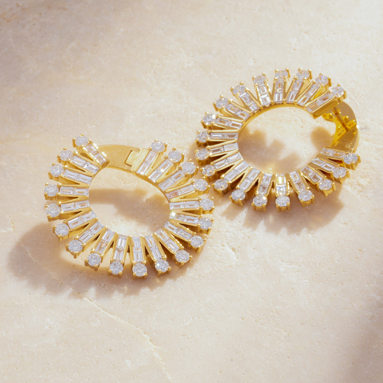 Introducing our exquisite 18K Gold Baguette Diamond Orbit Luna Earrings, a celestial-inspired masterpiece. Crafted with precision, these earrings feature mesmerizing baguette diamonds orbiting around a central lustrous 18K gold Luna. Elevate your style with these celestial treasures, perfect for adding a touch of elegance to any occasion.