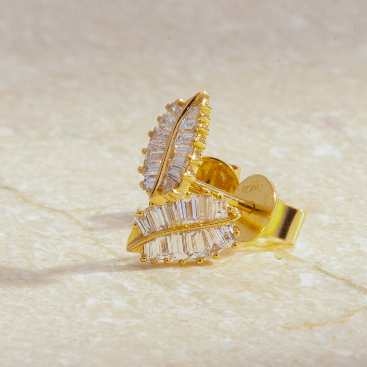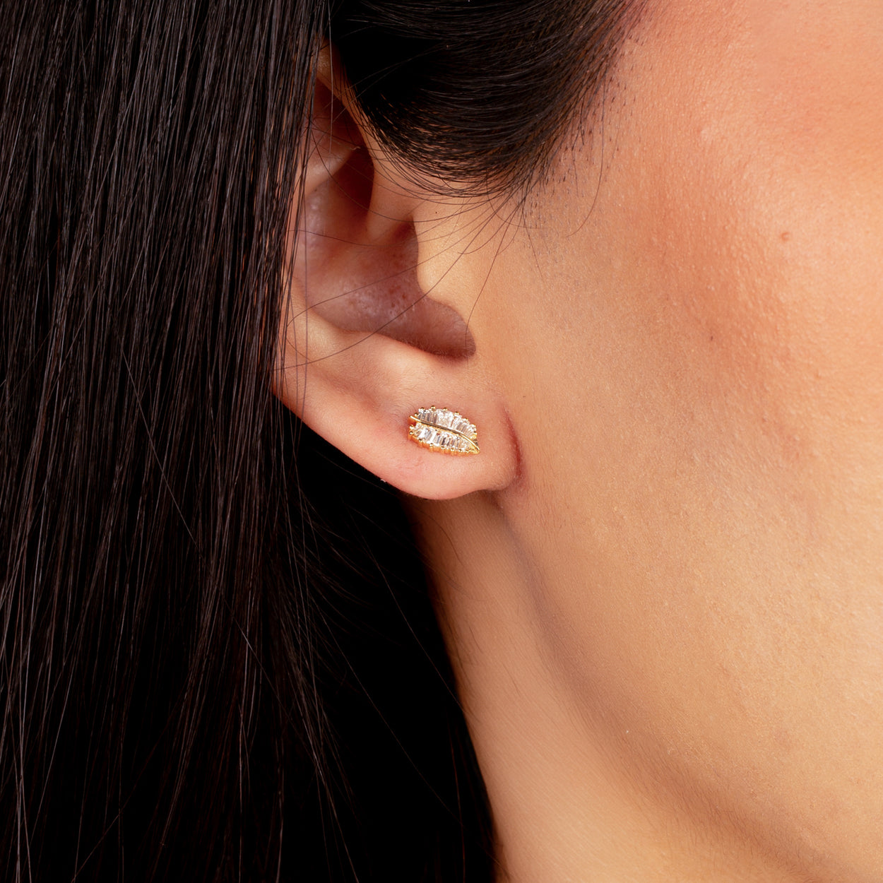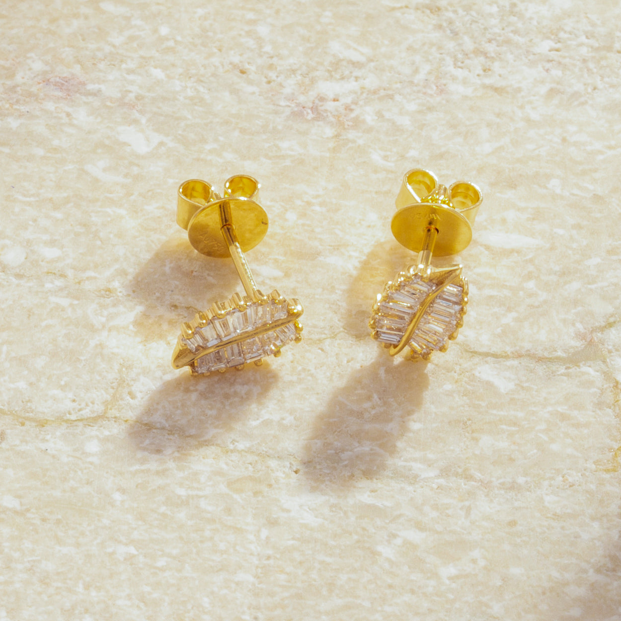 Introducing our exquisite 18K Gold Baguette Diamond Petite Palm Bliss Studs, a symbol of sophistication and luxury. Crafted with precision, these studs feature delicate baguette diamonds set in lustrous 18K gold, evoking the tranquility of palm leaves. Perfect for adding a touch of elegance to any ensemble, they are a timeless addition to your jewelry collection.