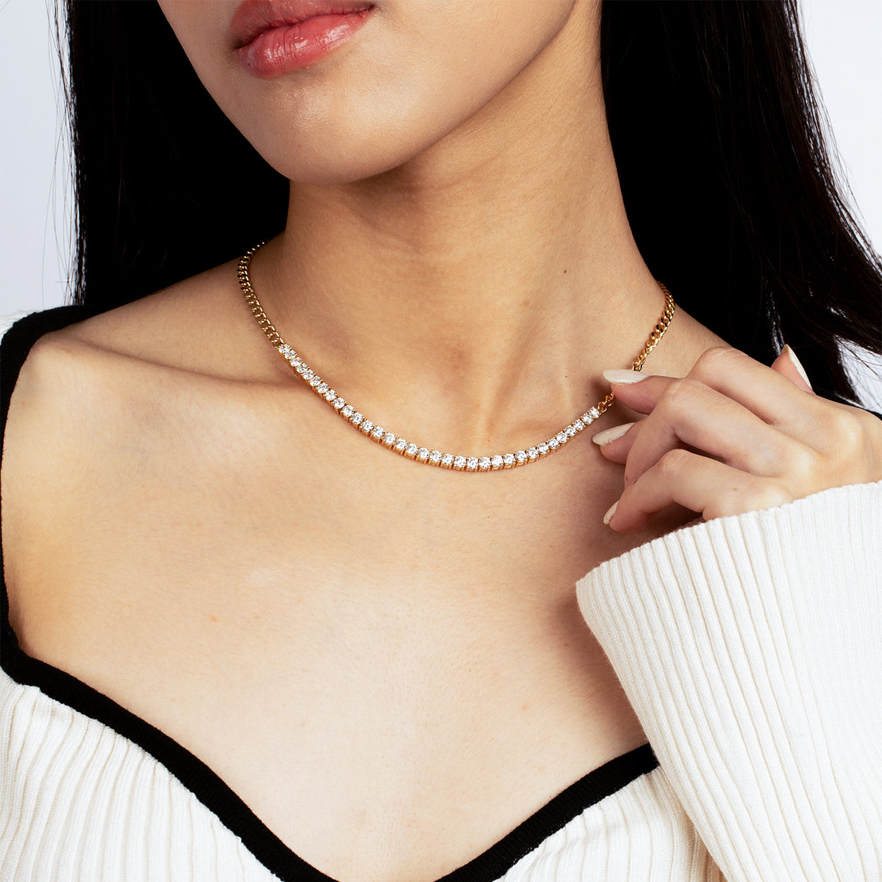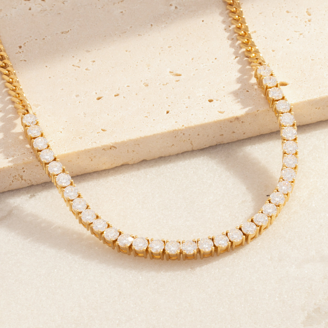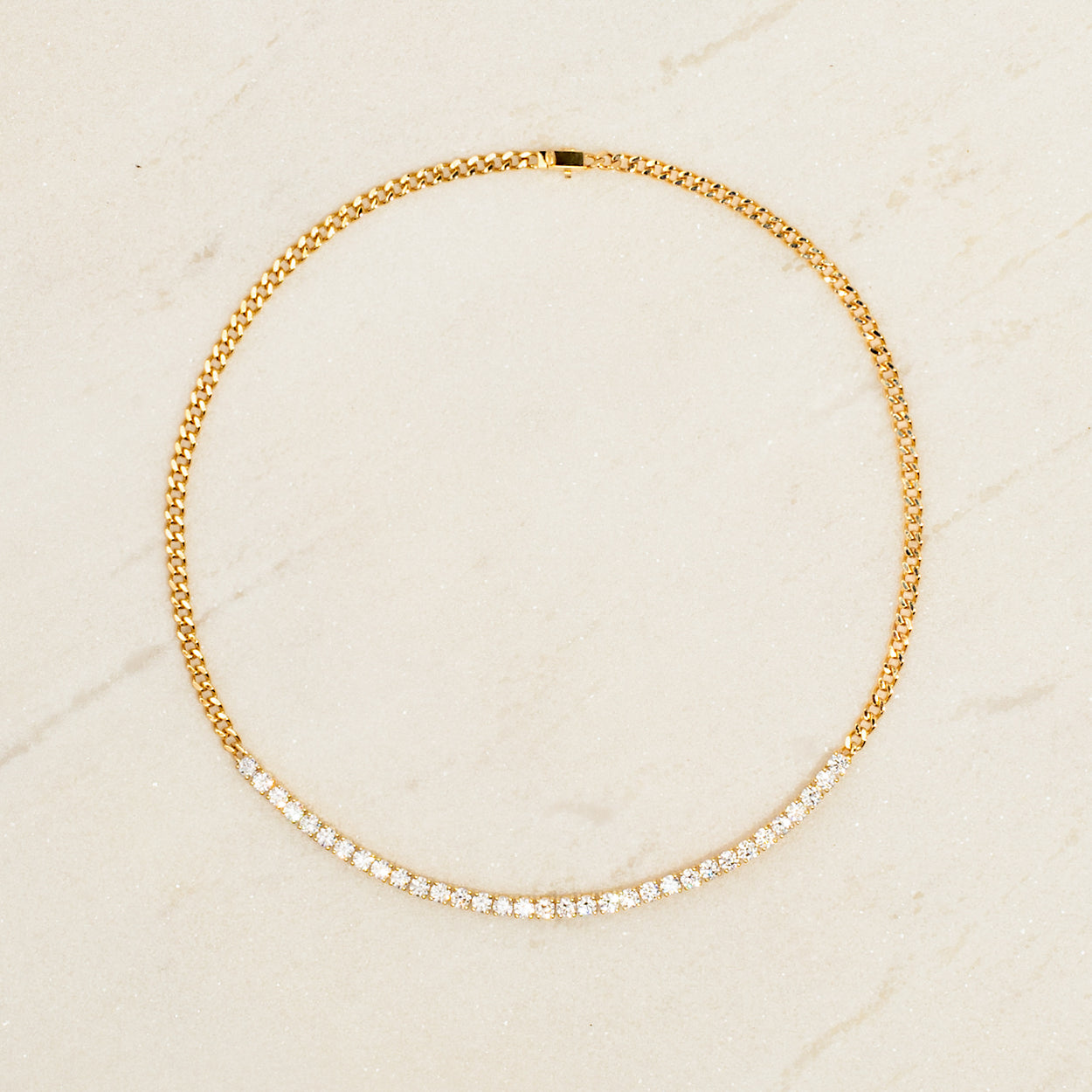 Introducing our striking 18K Gold Cuban Chain & Half Diamond Tennis Choker, a blend of boldness and elegance. Featuring alternating Cuban chain links and half-diamond tennis motifs, this piece exudes opulence and style. Elevate your look with this captivating choker, a symbol of refined luxury and timeless charm.