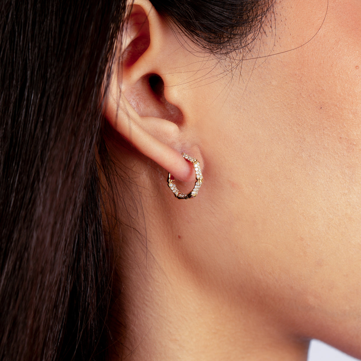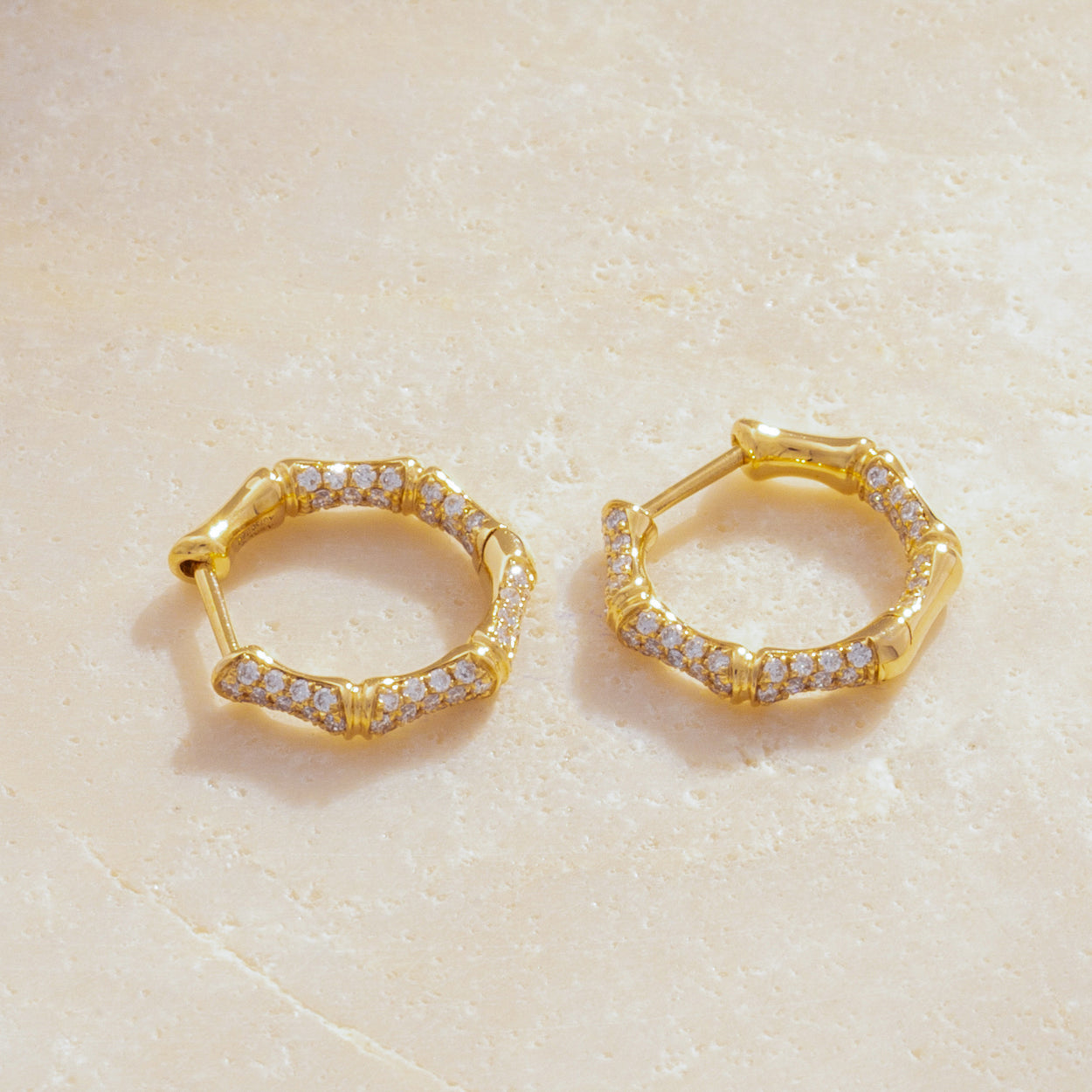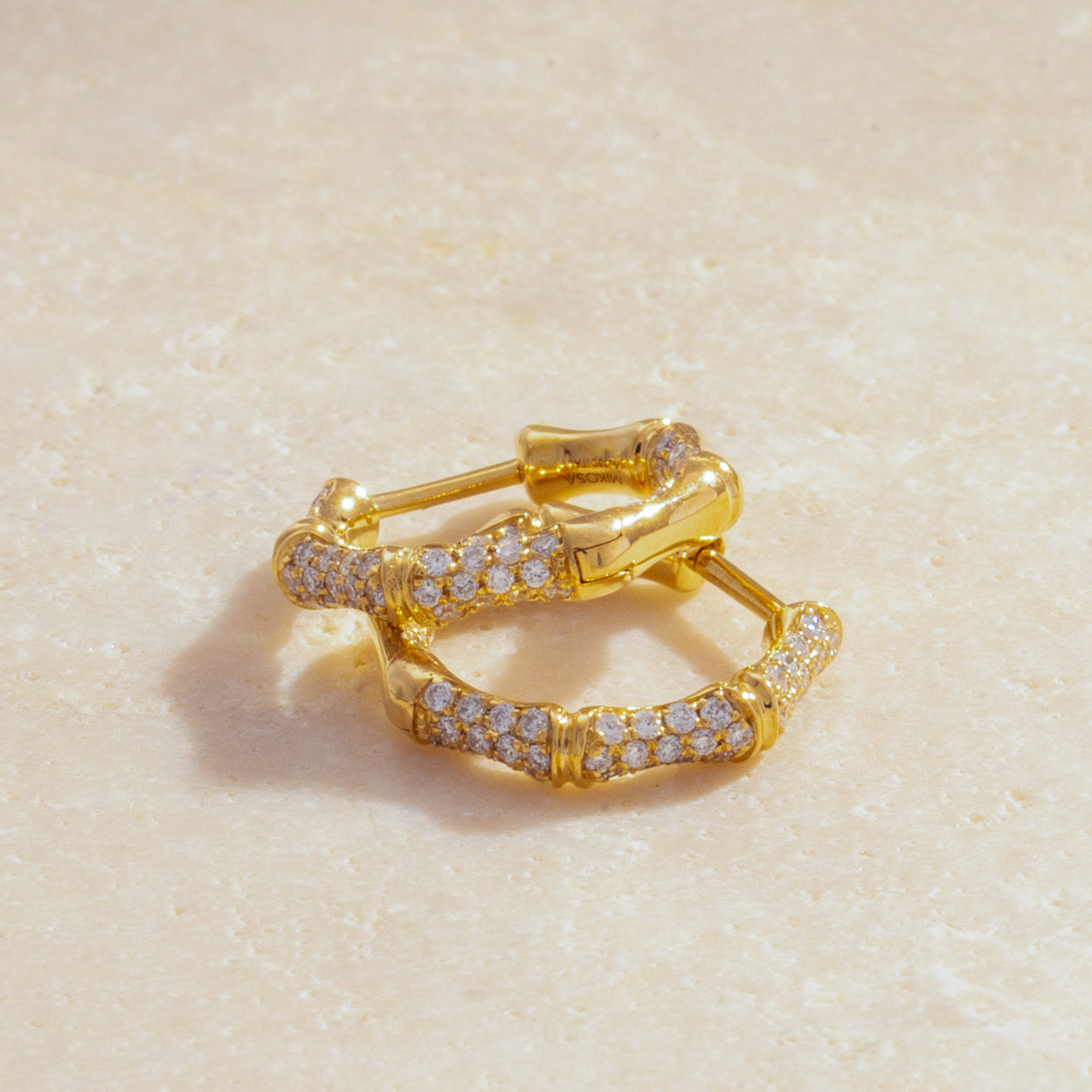 Introducing our exquisite 18K Gold Diamond Pave Bamboo Huggies, inspired by nature's grace. Crafted with precision, these huggies earrings feature intricate bamboo motifs adorned with sparkling pave diamonds, all set in lustrous 18K gold. Elevate your style with these unique earrings, perfect for adding a touch of sophistication to any ensemble.