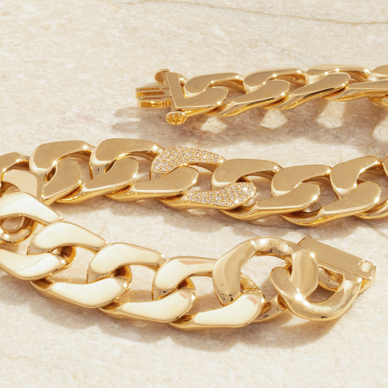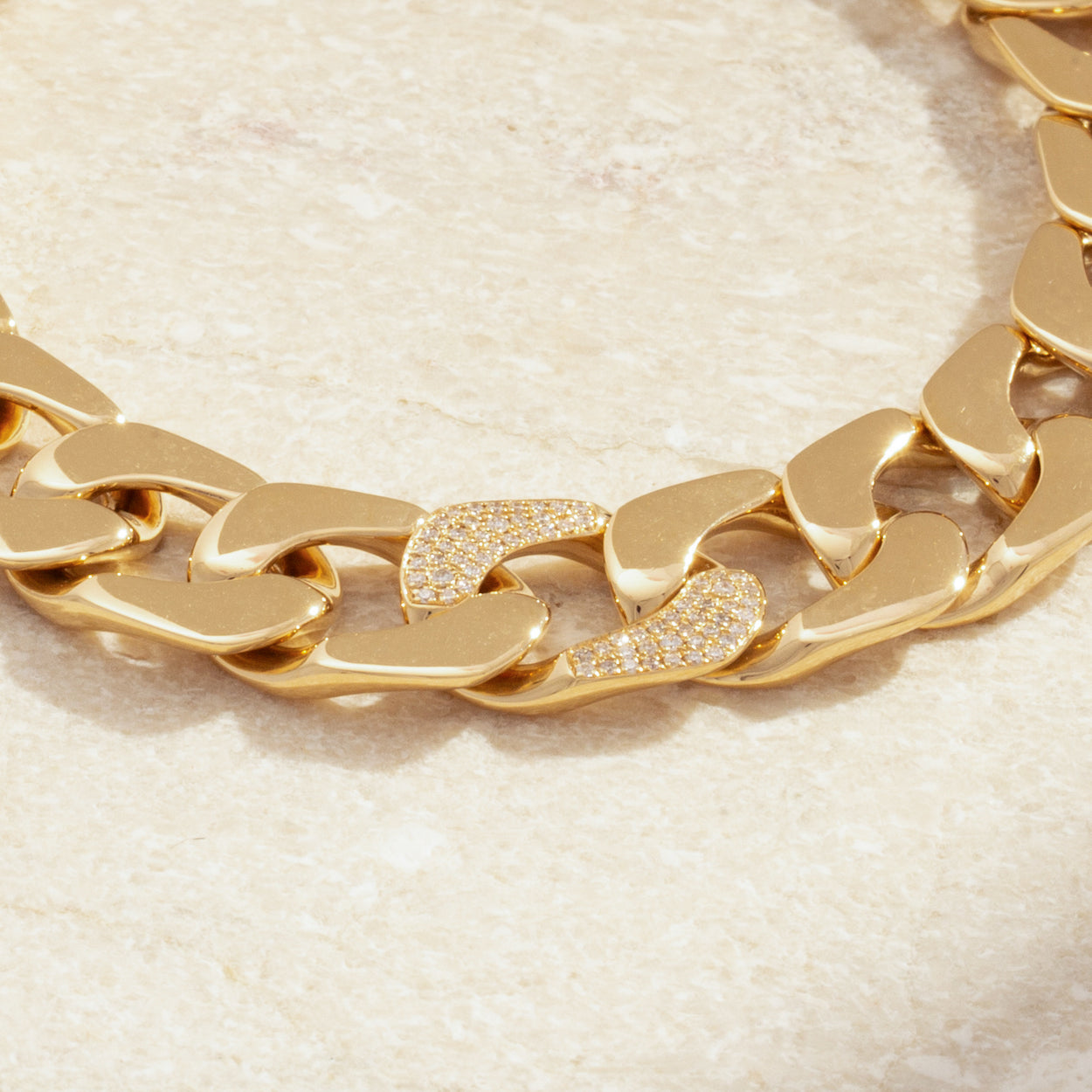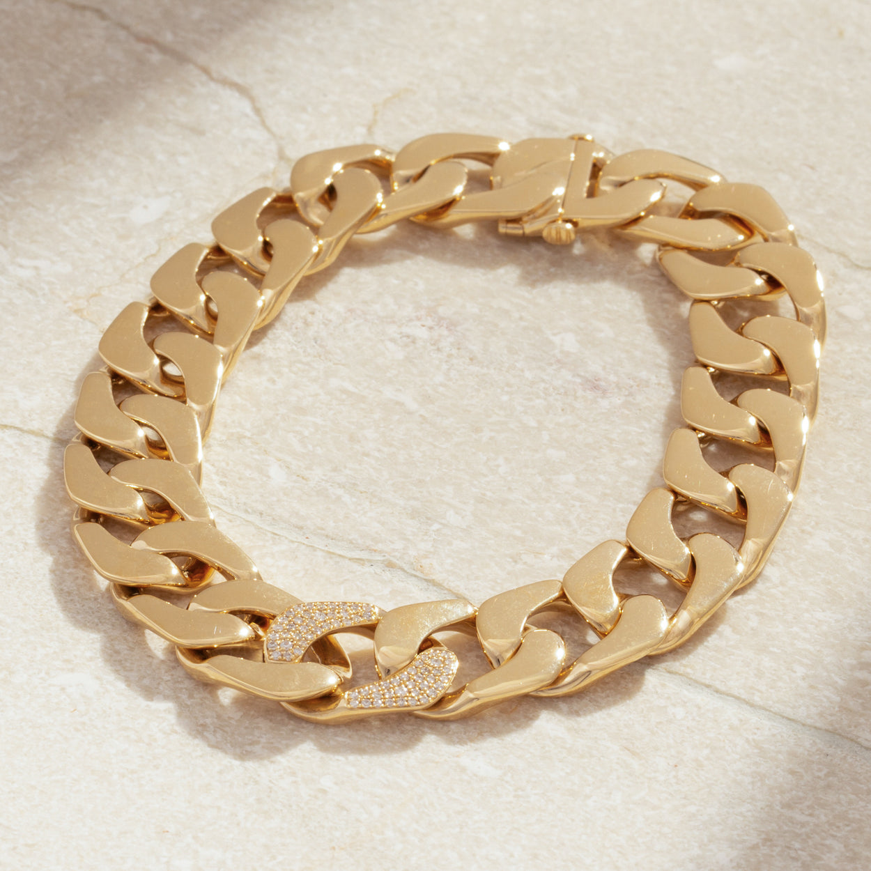 Indulge in luxury with our exquisite 18K Gold Flat Cuban Bracelet, adorned with stunning diamond pave links. Crafted to perfection, each link exudes elegance and sophistication, enhancing your style with its radiant sparkle. Elevate any ensemble effortlessly with this timeless piece, a true embodiment of opulence and grace.