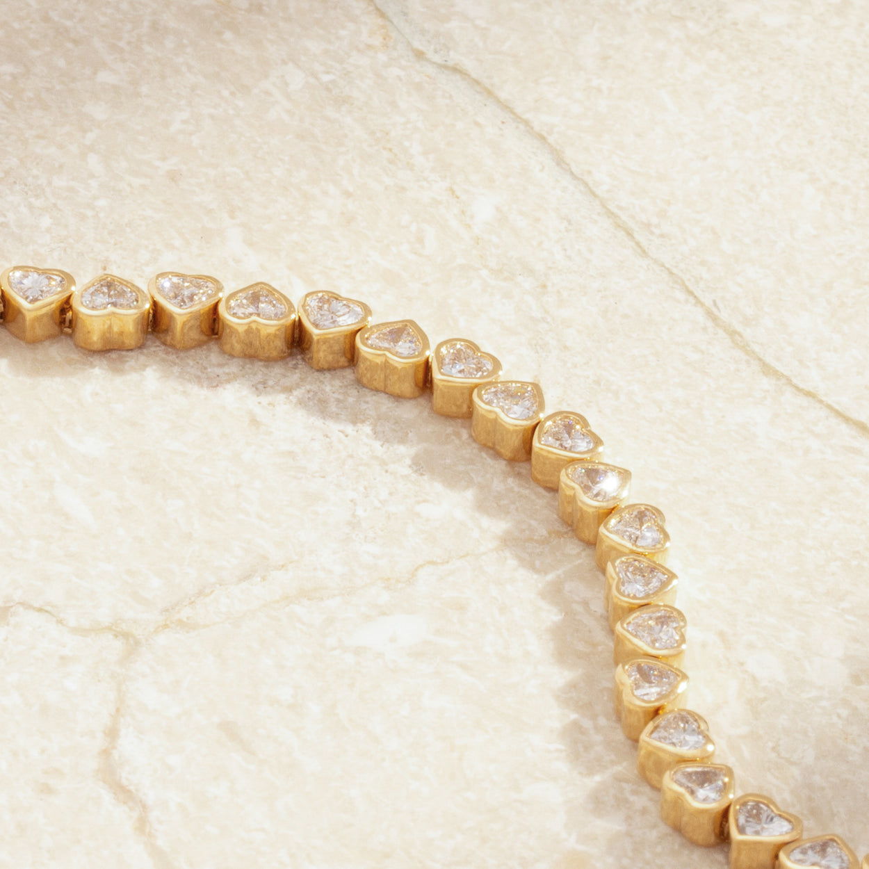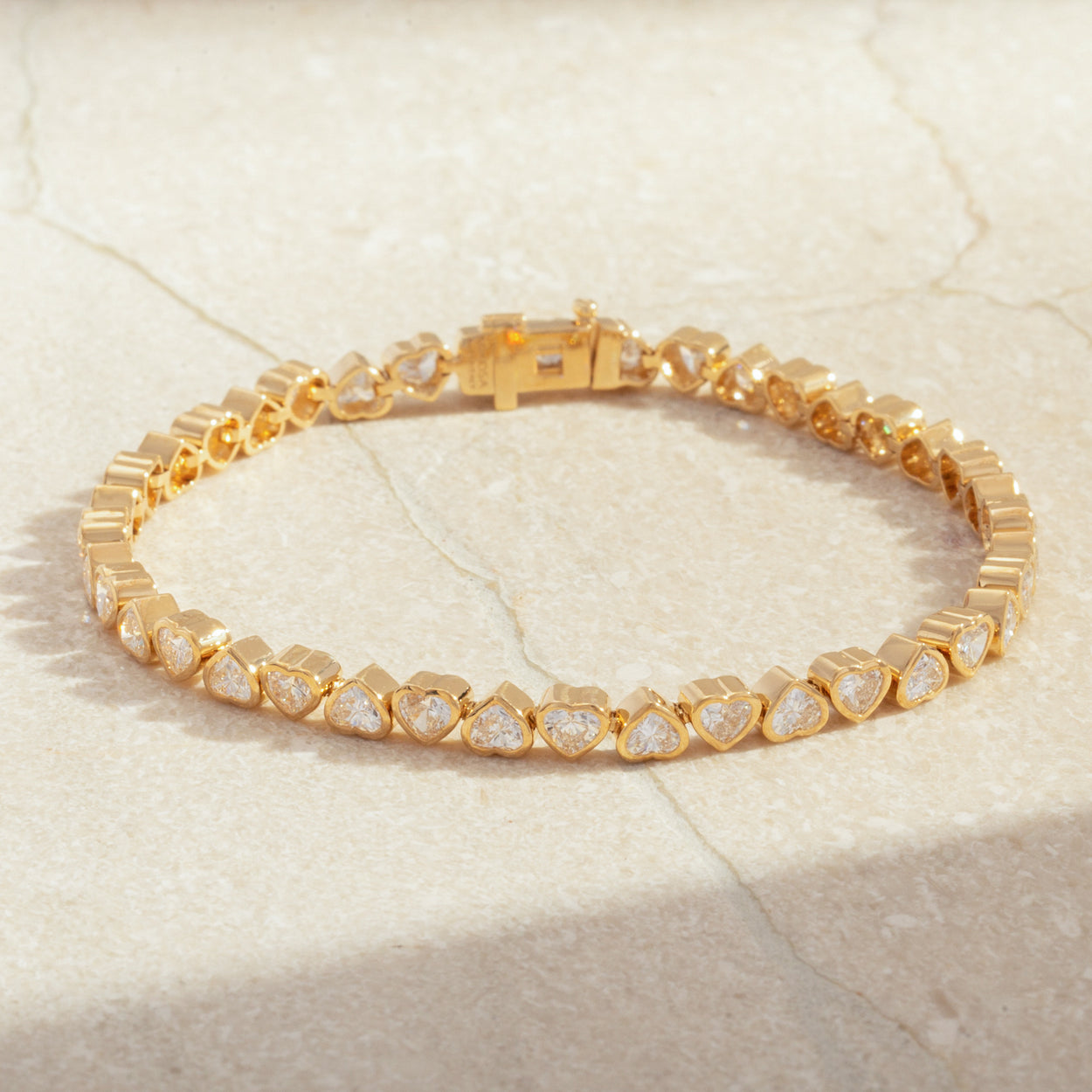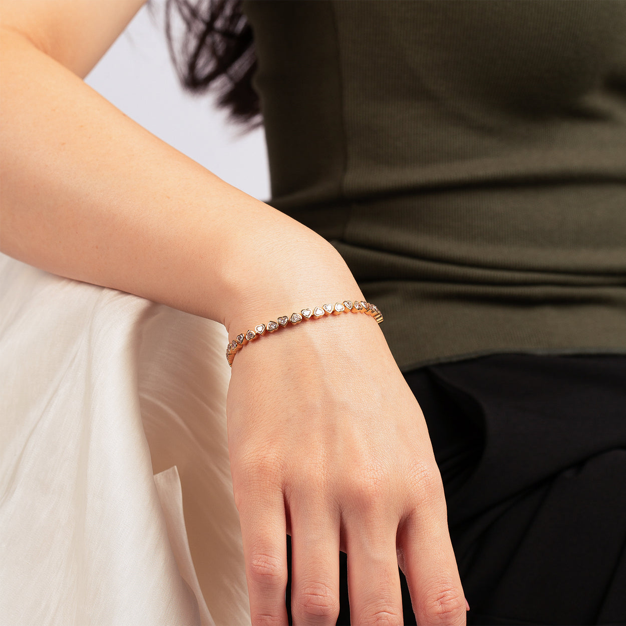 Introducing our enchanting 18K Gold Heart Diamond Bezel Tennis Bracelet, a celebration of love and elegance. Crafted with dazzling diamonds encased in delicate heart-shaped bezels, each link exudes timeless charm and sophistication. Elevate your style effortlessly with this symbol of enduring romance and refined taste.
