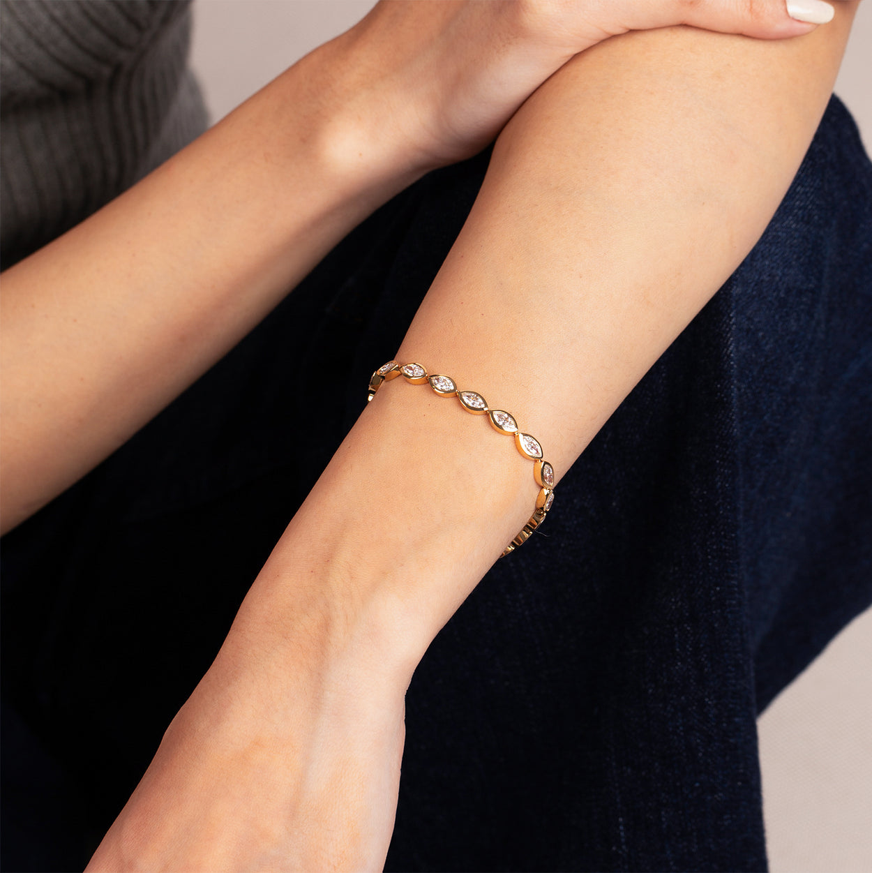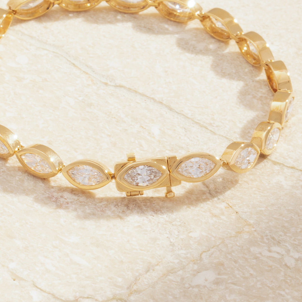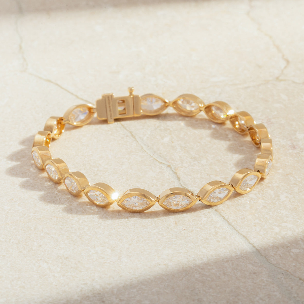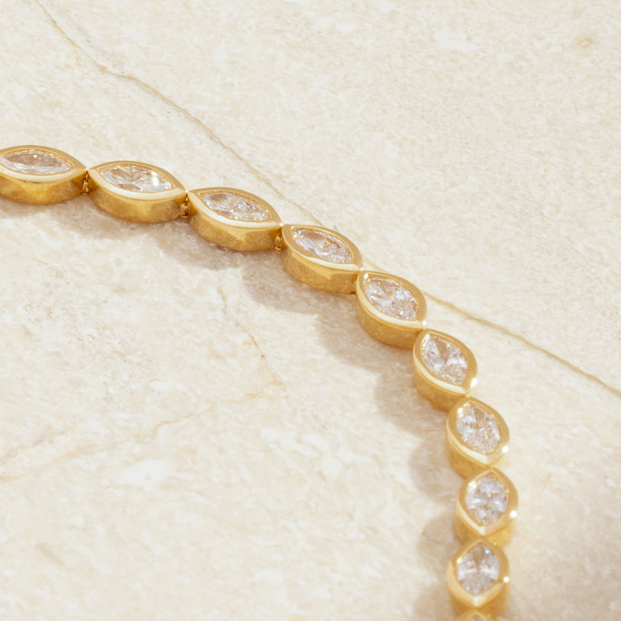 Introducing our captivating 18K Gold Marquise Diamond Bezel Tennis Bracelet, a fusion of elegance and brilliance. Crafted with exquisite marquise-cut diamonds set in delicate bezels, each link radiates sophistication and luxury. Elevate your style effortlessly with this timeless piece, a symbol of refined taste and opulent charm.