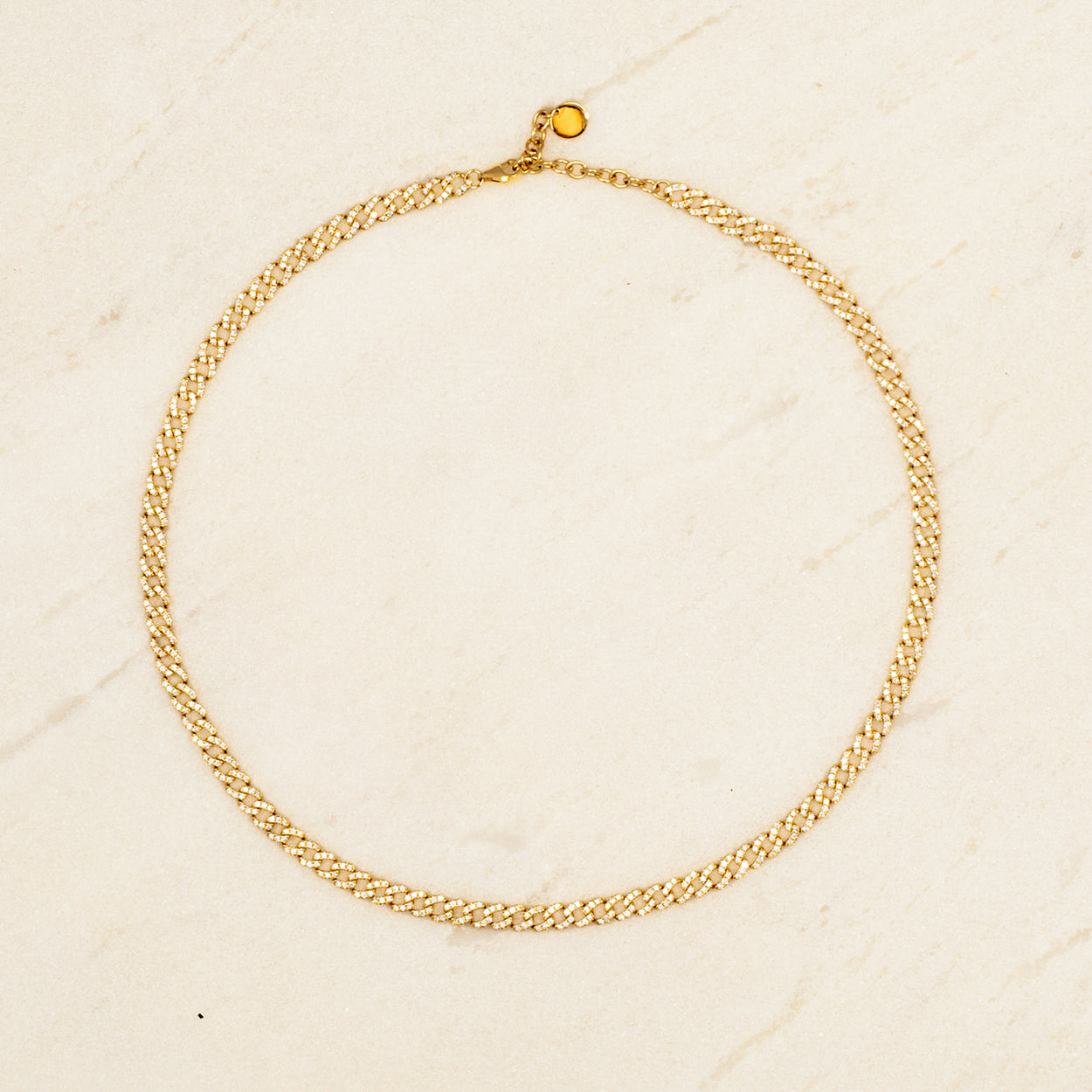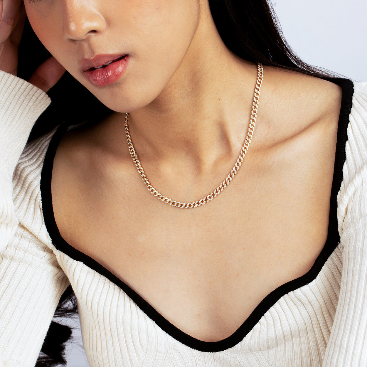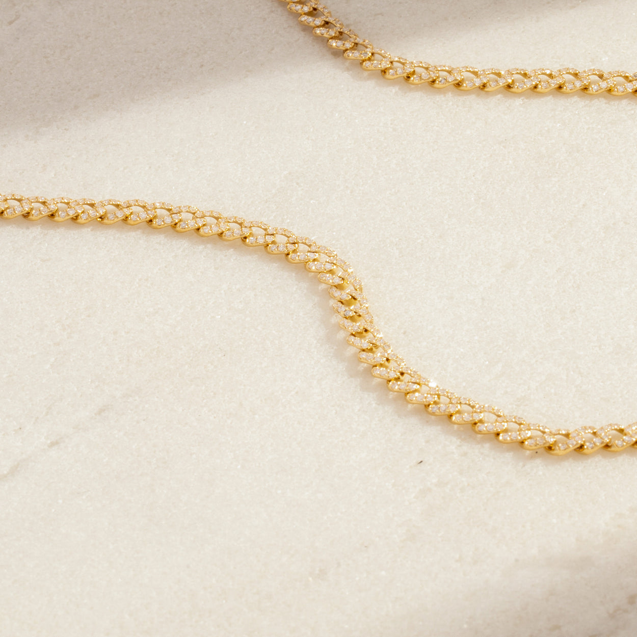 Introducing our chic 18K Gold Mini Cuban Link Diamond Paved Necklace, a fusion of sophistication and sparkle. Each link intricately paved with dazzling diamonds exudes opulent charm and elegance. Elevate your style effortlessly with this captivating piece, a symbol of refined taste and timeless luxury.