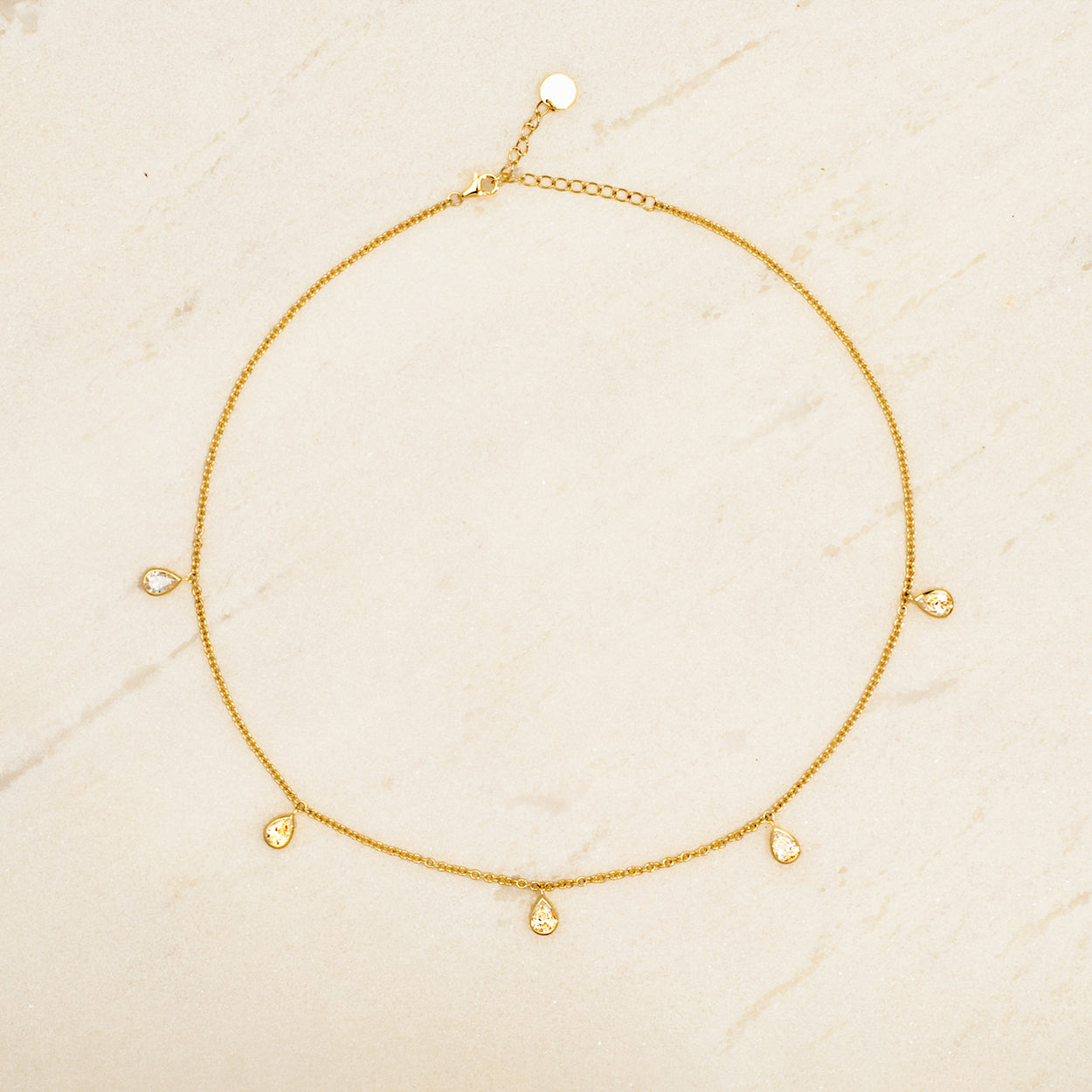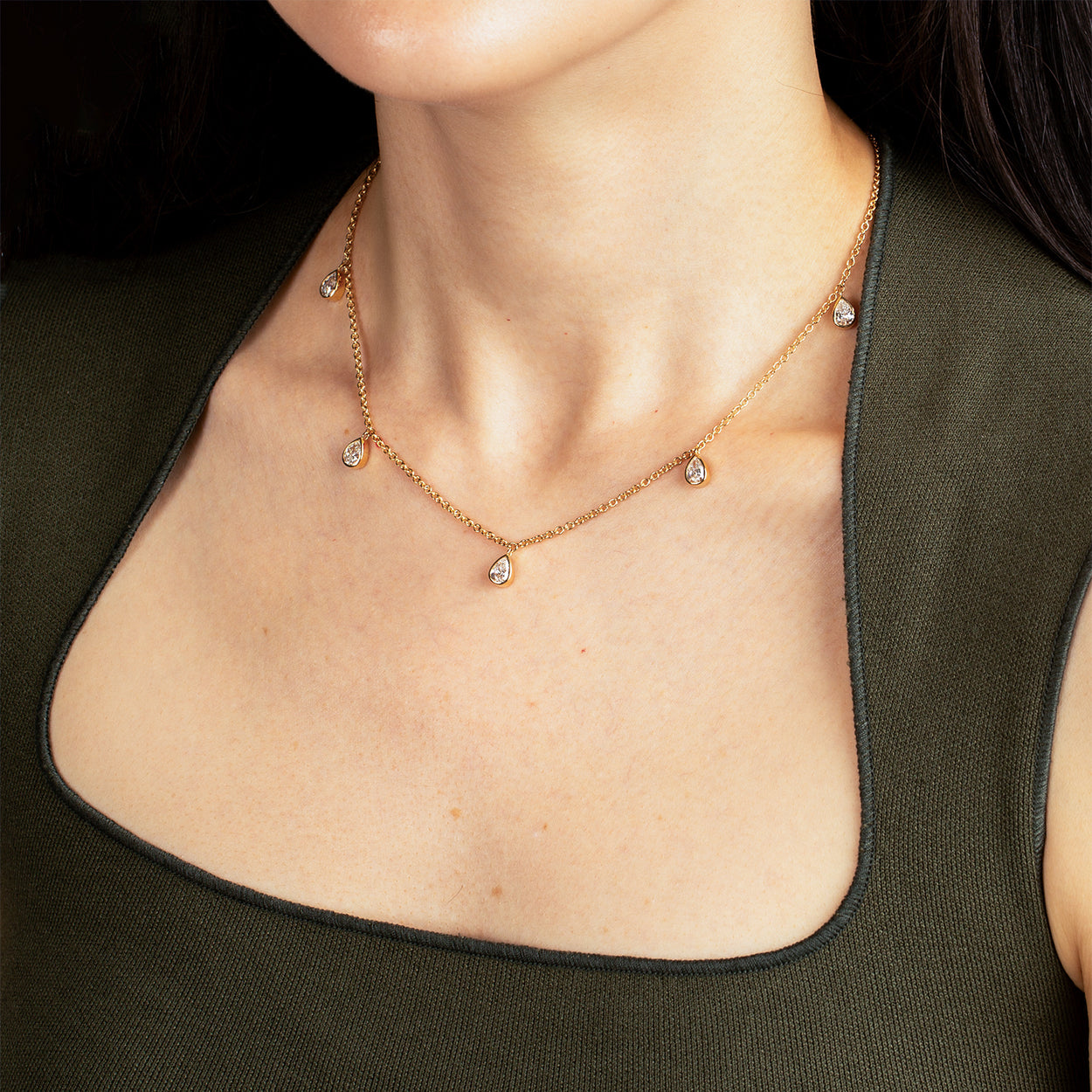 Introducing our exquisite 18K Gold Pear Cut Diamond Teardrop Choker, a symbol of refined elegance. Each pear-cut diamond delicately suspended in a teardrop design exudes timeless charm and sophistication. Elevate your style effortlessly with this captivating piece, radiating opulent luxury and allure.