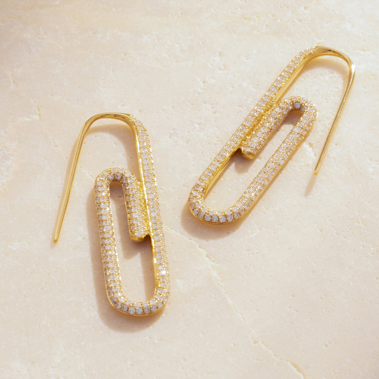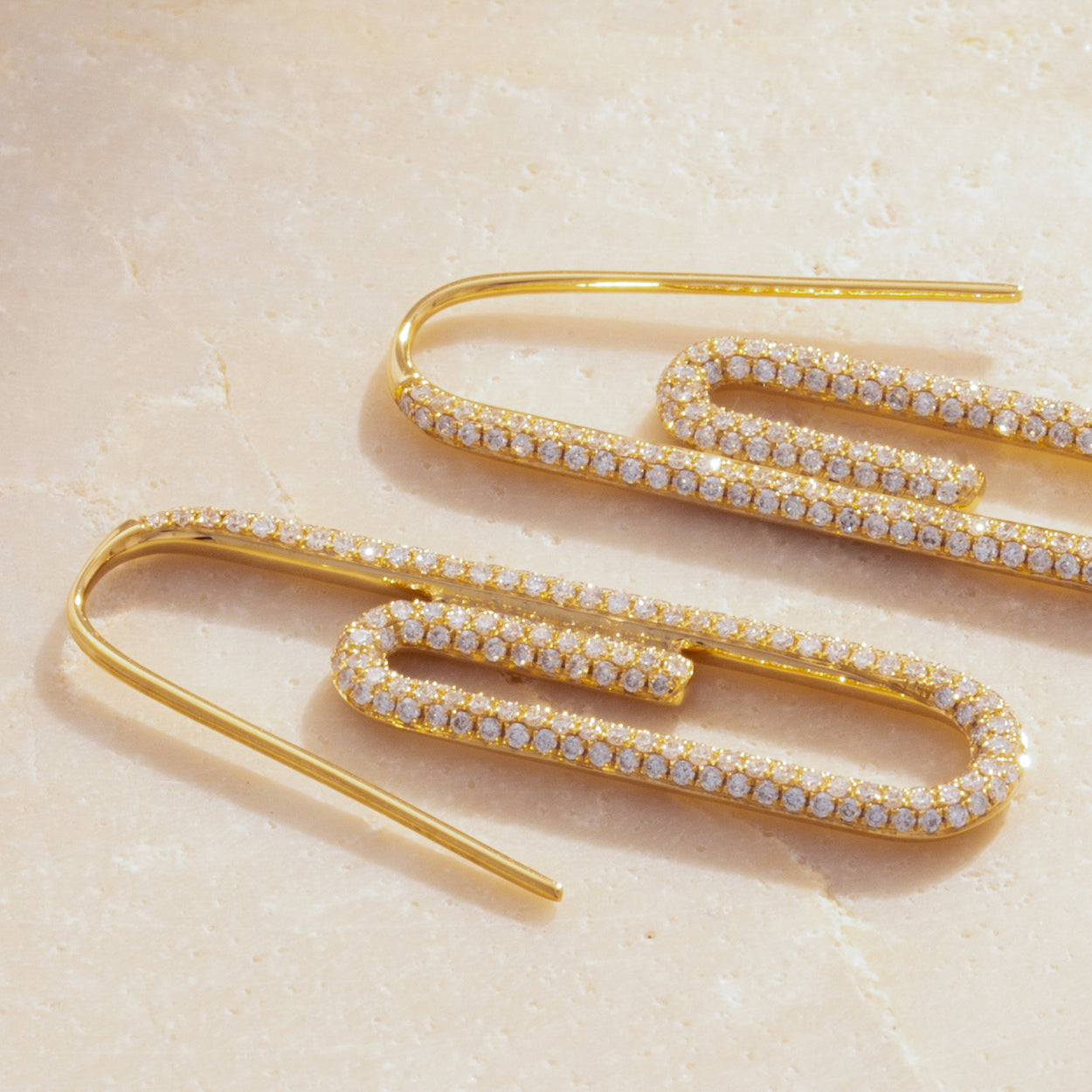 Introducing our exquisite 18K Yellow Gold Diamonds Paved Paperclip Earrings, a fusion of modern design and timeless elegance. Crafted with precision, these earrings feature a stunning paperclip silhouette adorned with dazzling diamonds, all set in luxurious 18K yellow gold. Make a statement with these chic and versatile earrings, perfect for adding a touch of glamour to any outfit.