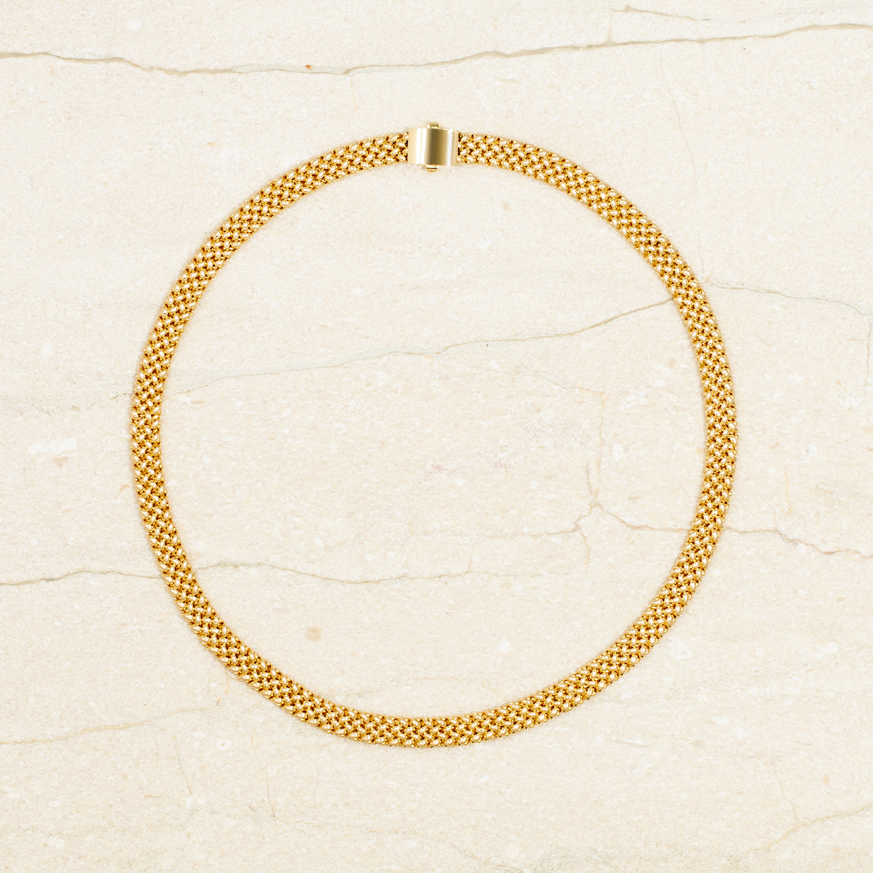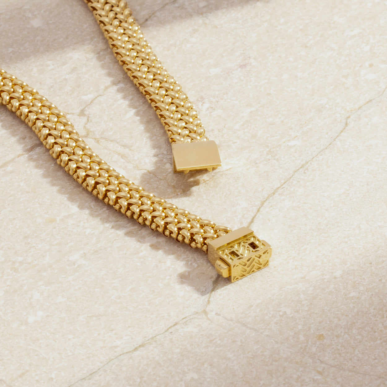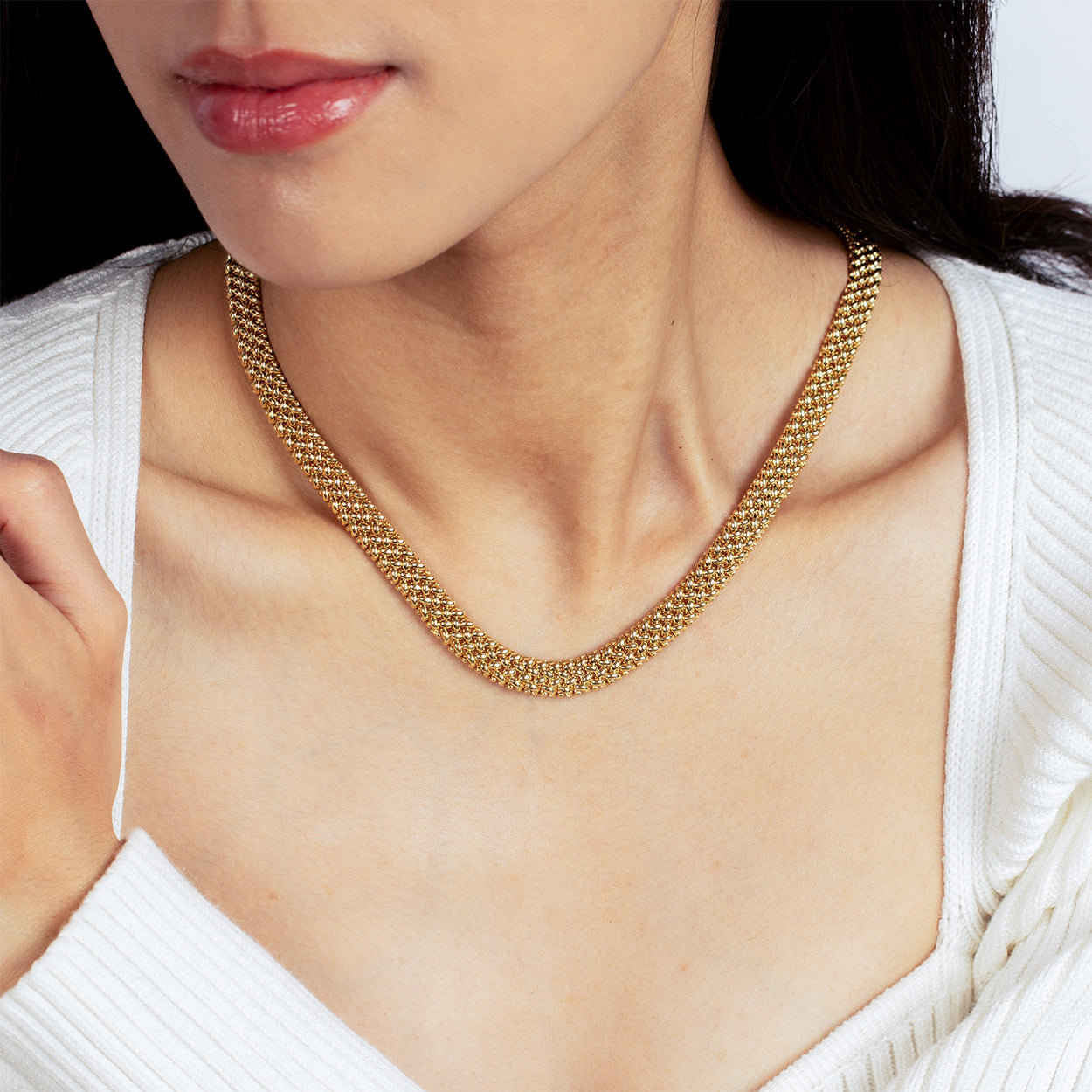 Elevate your neckline with our Classic Large Pebbled 18K Gold Necklace. Each pebbled link meticulously crafted in luxurious 18K gold, offering timeless elegance and sophistication. Make a statement with this versatile piece, perfect for adding a touch of opulence to any ensemble.