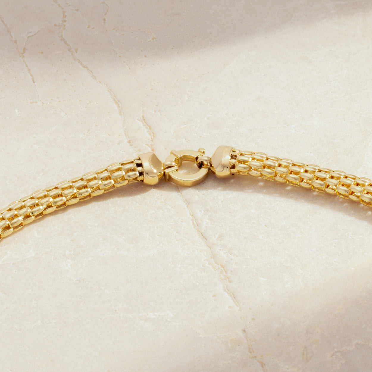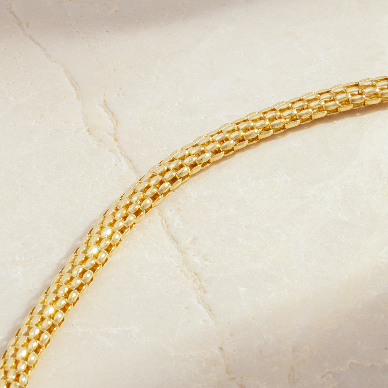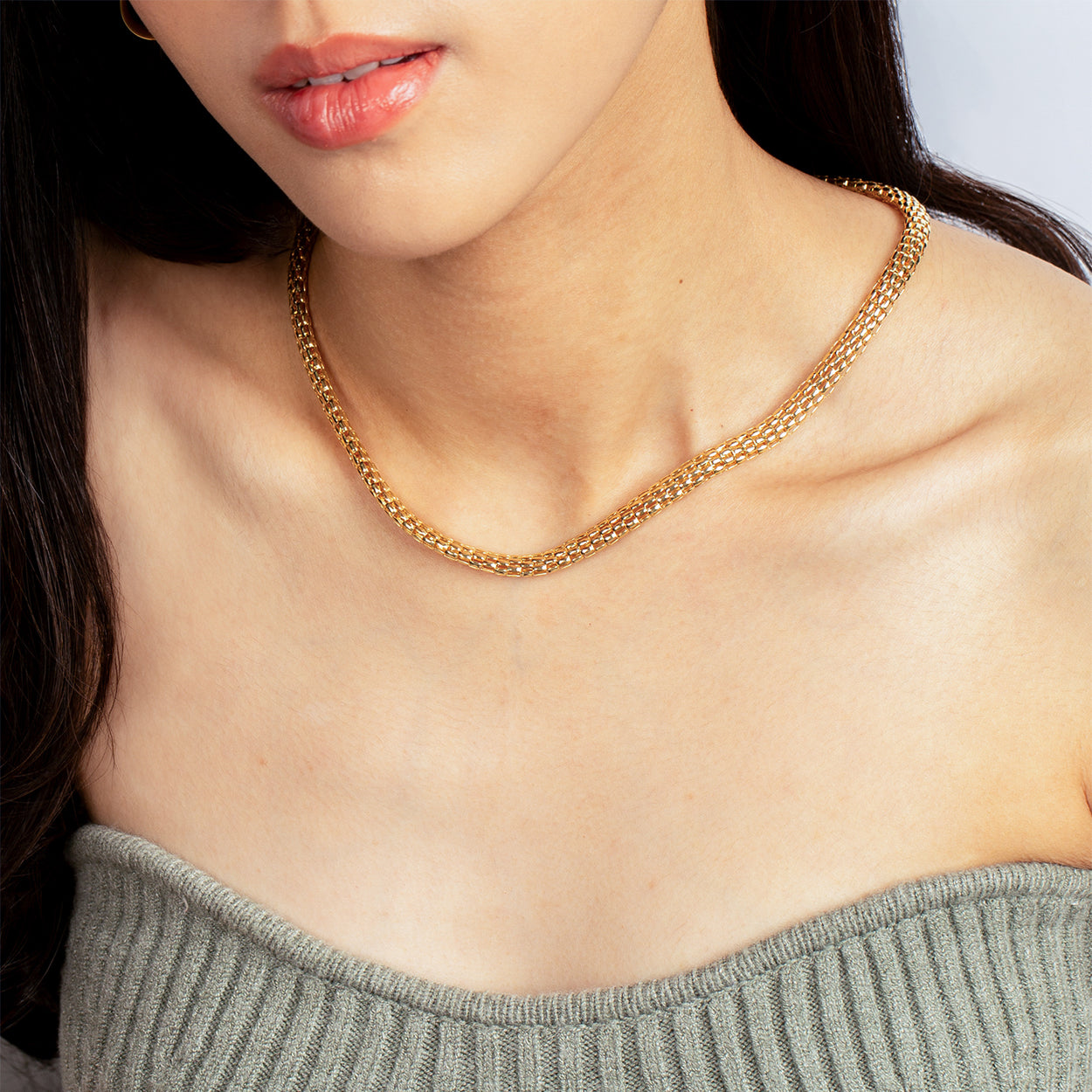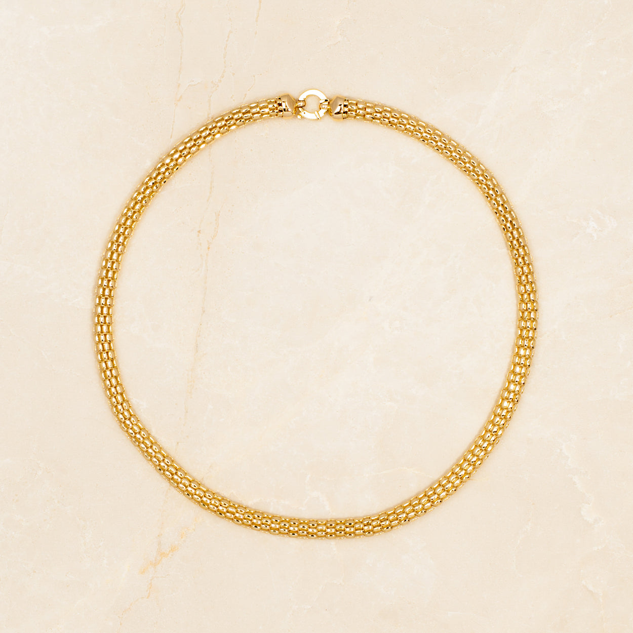 Embrace timeless elegance with our Classic Pebbled 18K Gold Necklace. Each meticulously crafted pebbled link exudes sophistication and luxury in radiant 18K gold. Elevate any ensemble with this versatile statement piece, perfect for adding a touch of opulence to your neckline.